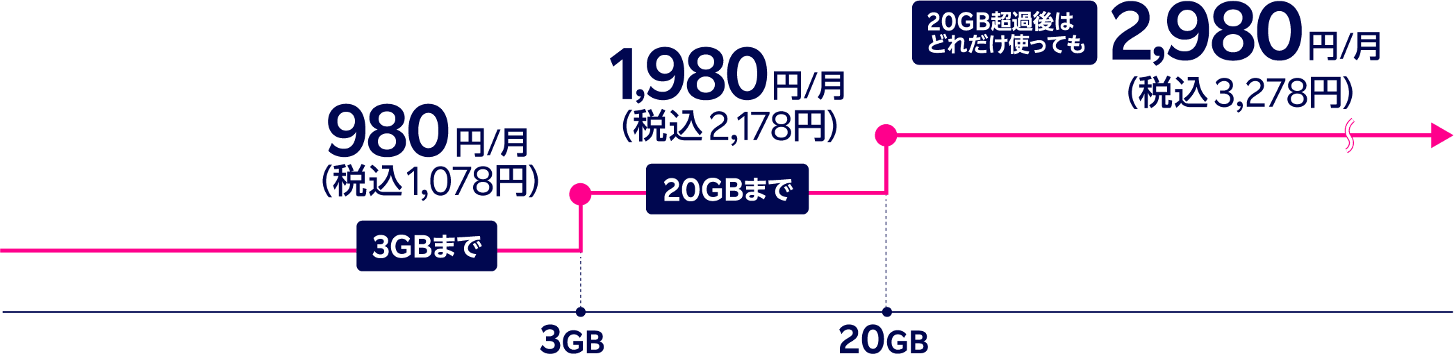 | 3GBまで | 月額980円(税込1,078円) | |
