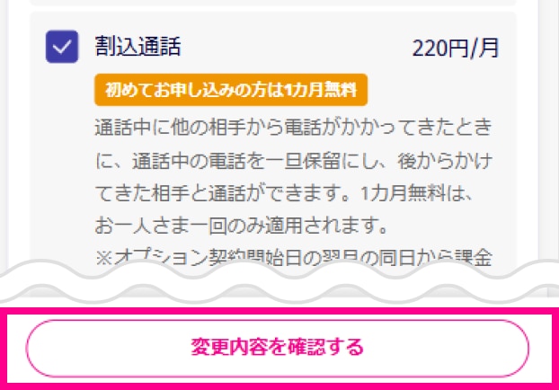 3.オプションサービスの「割込通話」にチェックを入れ、ページ下部の「変更内容を確認する」をタップする