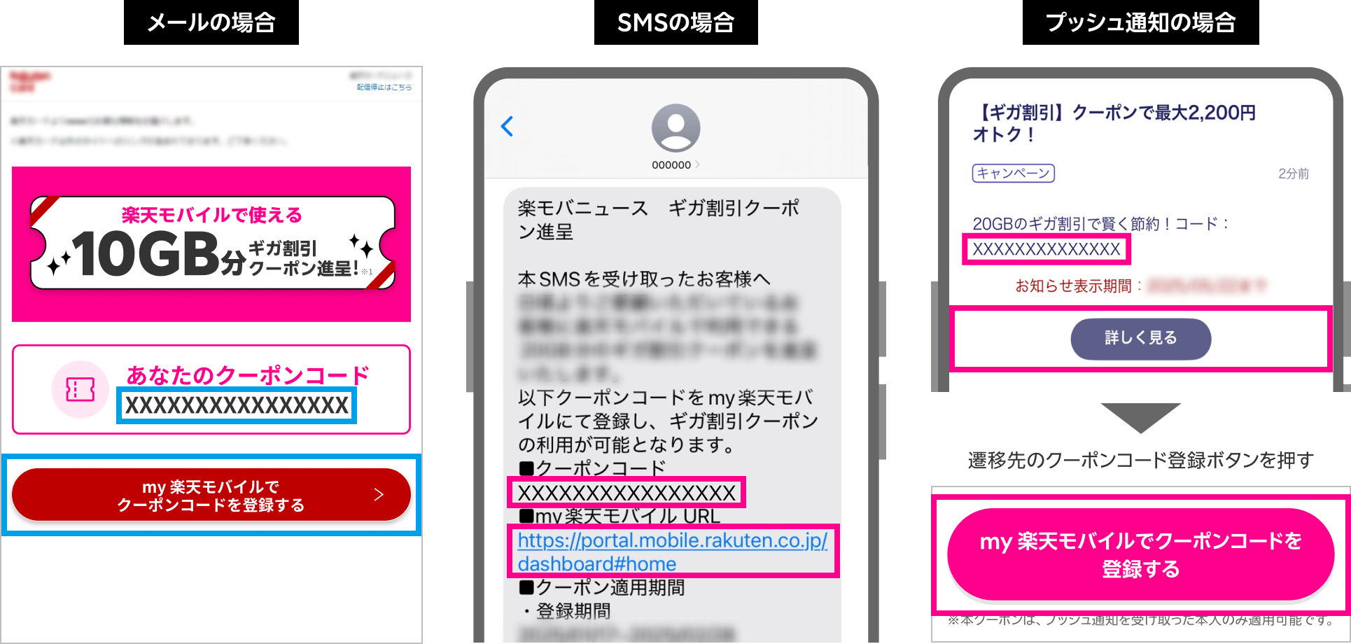 クーポンコードを受け取ったメール・SMS・プッシュ通知を開き、記載のクーポンコードをコピーのうえ、my 楽天モバイルへのボタンまたはURLを押してください。
