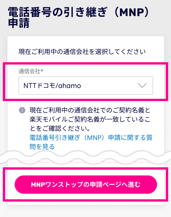 「NTTドコモ/ahamo」を選択いただくと、ahamo(NTTドコモと共通)のMNPワンストップ申請ページに移動します。