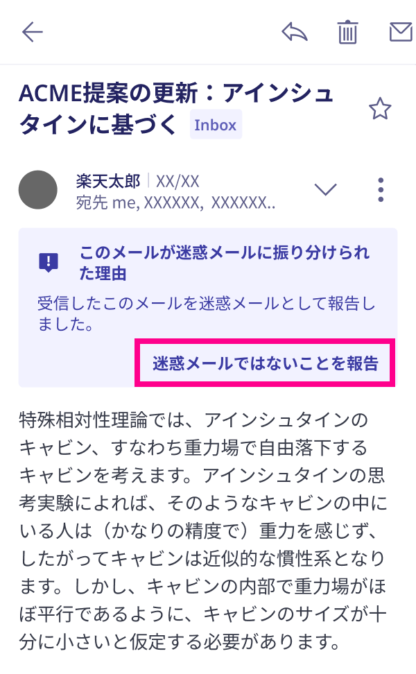 迷惑メールに振り分けられた理由の下にある「迷惑メールでないことを報告」をタップしてください。