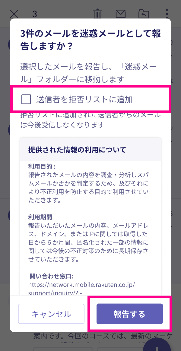 送信者を今後受信したくない場合は「送信者を拒否リストに追加」にチェックを入れ、「報告する」ボタンをタップしてください。
