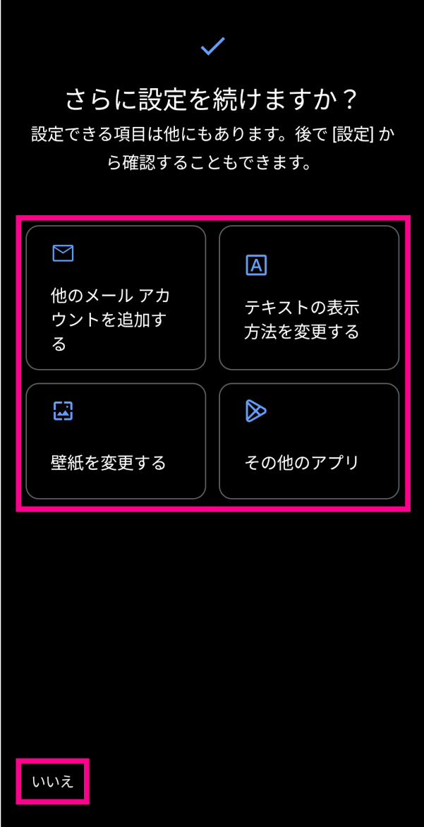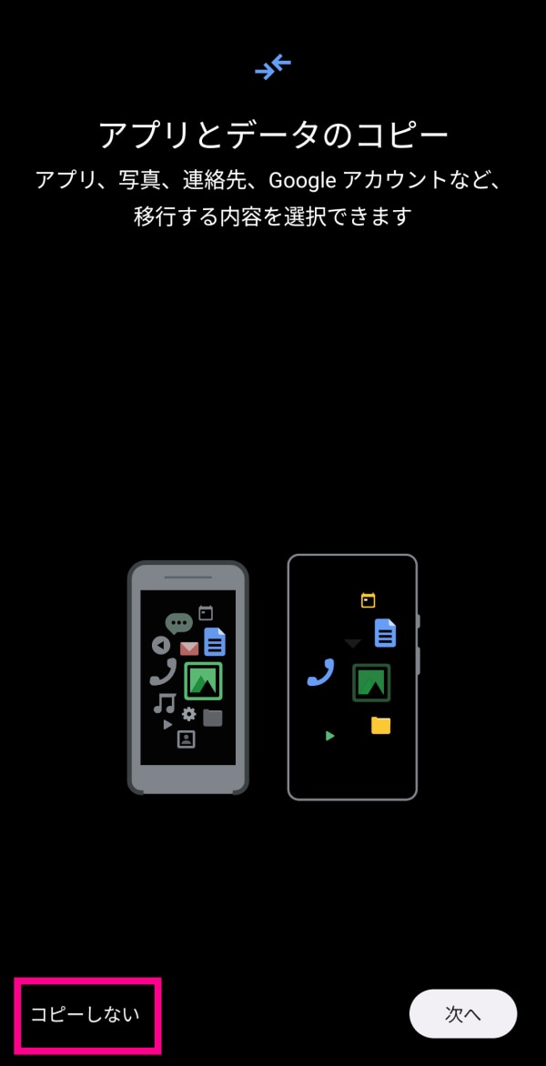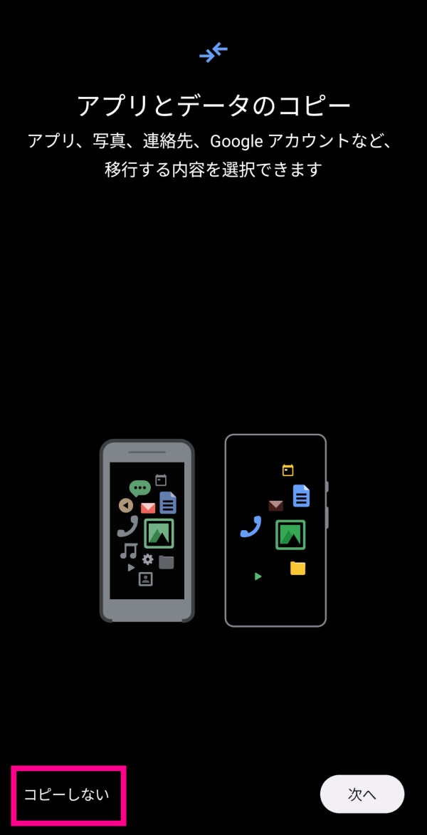 ※別の端末からアプリなどをコピーする場合は、「次へ」をタップして画面の指示に従ってコピーしてください。