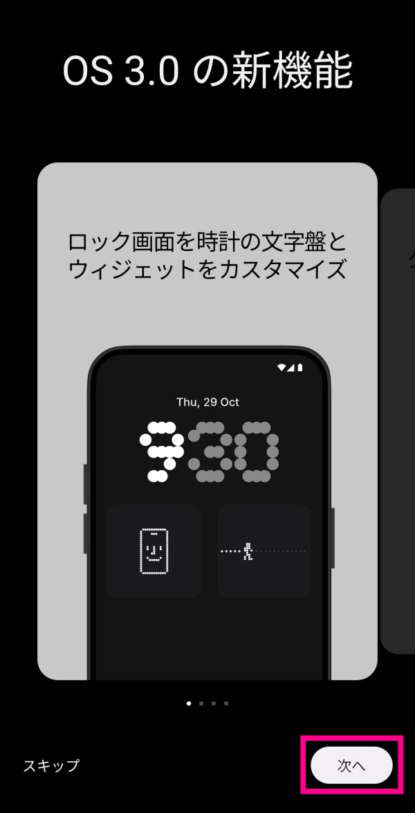 17. 17. 新機能の紹介画面です。確認したい場合は「次へ」をタップしてください。
