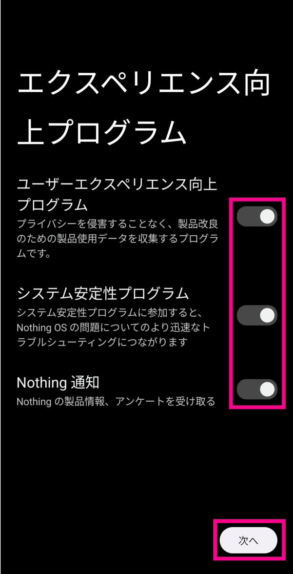 15. 15. 任意でエクスペリエンス向上プログラムを設定し、「次へ」をタップしてください。
