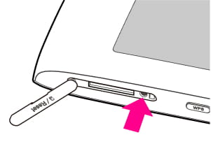 細い棒状のものでリセットボタン(丸いくぼみにあるボタン)を5秒程度長押し