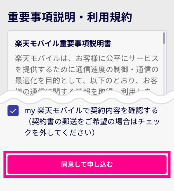 6. 重要事項説明などを確認し、「同意して申し込む」をタップする