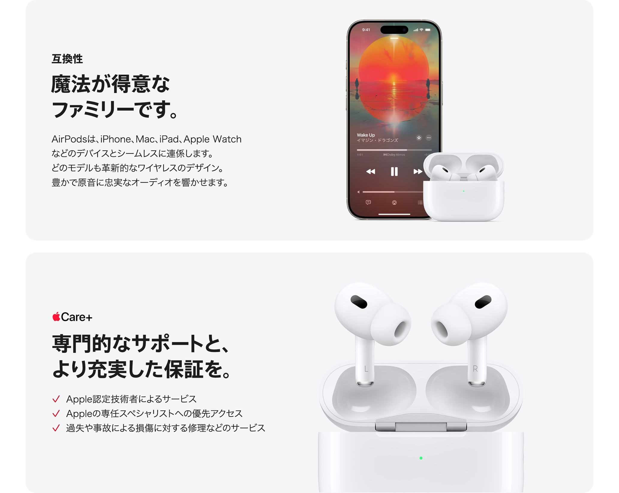 - ※7 AirPods Pro 2にはIP54等級の防塵性能と耐汗耐水性能があります。水上または水中でのスポーツやエクササイズには対応しません。防塵性能と耐汗耐水性能は永続的に維持されるものではありません。