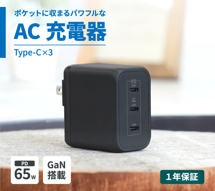 最大PD65W出力 GaN採用 USB Type-C×3 AC充電器