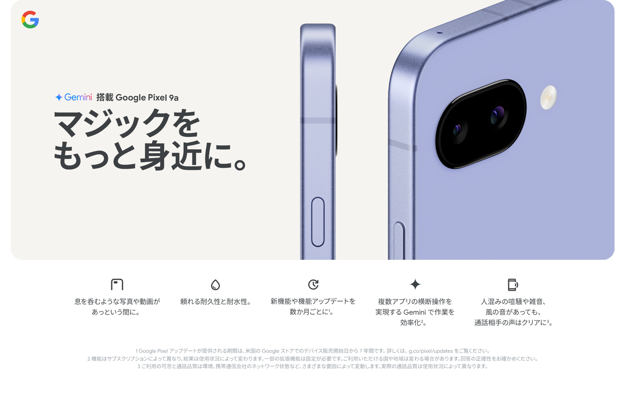 他社から乗り換えの場合48回払いで※ 750円/月〜(1〜24回まで、25回目以降3,083円〜) ※ 現金一括払い/割賦販売価格92,000円~、楽天カード支払い48回(25~47回目3,083円/月~、48回目3,091円/月~)支払期間48カ月、実質年率0%。楽天モバイルから、 Google Pixel ついに登場。マジックをもっと身近に Google Pixel 9a