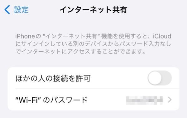 「設定」>「インターネット共有」でインターネット共有の設定画面を開き、「ほかの人の接続を許可」のスライダを左にスワイプしてオフにします。