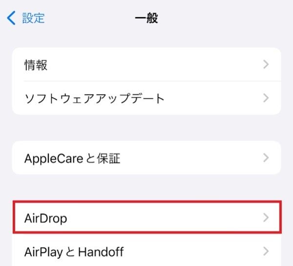 まずは「設定」>「一般」>「AirDrop」の順にタップして、AirDropの設定画面を開きます。