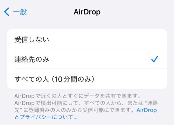 「連絡先のみ」にすると、受信側の連絡先に登録されている人からのみAirDropでデータ受信が可能です。「すべての人(10分間のみ)」にすると制限なく認識されますが、10分後には「連絡先のみ」に設定が変更されます。