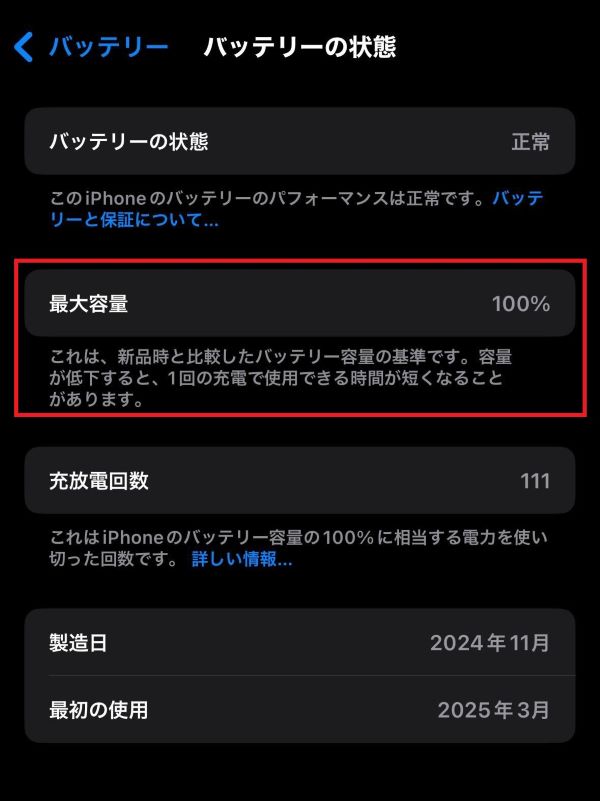 そのため、スマホの画面上で充電100%と表示されていても、現在の最大容量に対してフル充電されていることを意味しており、購入時と比べると実際に蓄えられる電力量は少なくなっています。なお、最大容量は、今どれだけ充電されているかを示す「バッテリー残量」とは異なります。