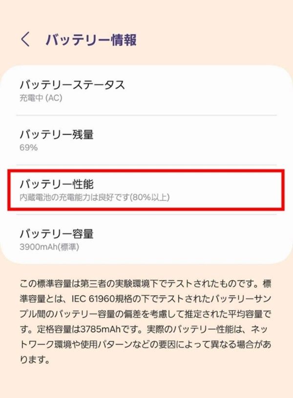 たとえば、Galaxy S23の場合は、「設定」アプリ内の「バッテリー」または「端末情報」>「バッテリー情報」から、バッテリー性能の項目で充電能力を確認できます。