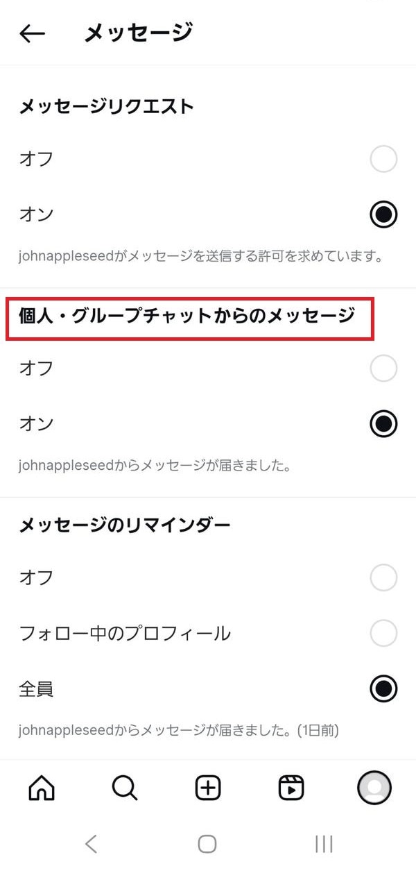「メッセージ」をタップして、「個人・グループチャットからのメッセージ」が「オフ」になっていないか確認し、場合によっては設定を変更しましょう。
