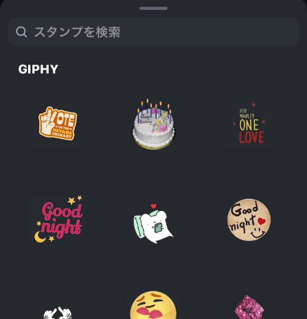 一覧からGIFスタンプを選択するか、「スタンプを検索」の欄にワードを入力してGIFスタンプの検索も可能です。