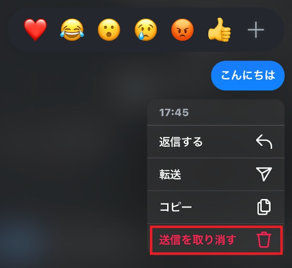 送信済みのメッセージを長押しすると「送信を取り消す」が選べます。取り消したメッセージは、DMのチャット上で自分からも相手からも見られなくなります。