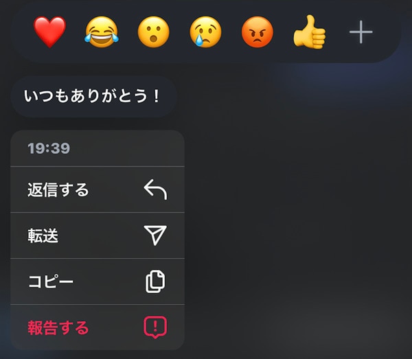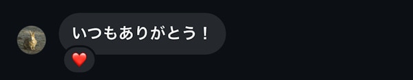 メッセージを長押しすると「ハート」以外のリアクションスタンプも選択可能です。