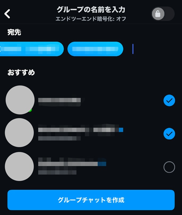 表示される候補や検索から、追加するユーザーを選んでグループを作成します。上部の入力欄でグループ名を付けることも可能です。