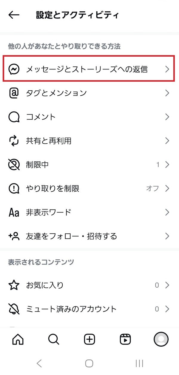 3.「他の人があなたとやり取りできる方法」の「メッセージとストーリーズへの返信」をタップする