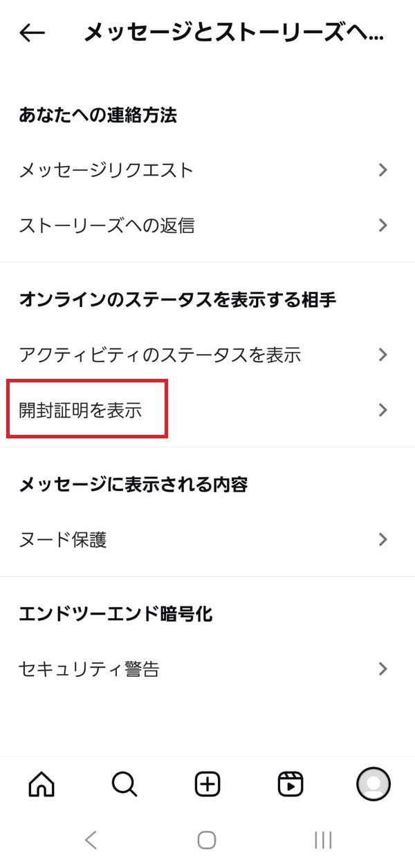 インスタのDMで既読を付けたくない場合は、開封証明の設定をオフに切り替えましょう。開封証明を切り替える手順は以下のとおりです。
