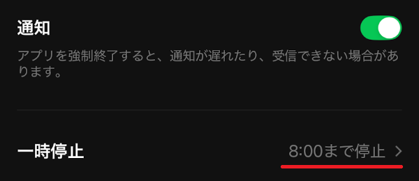 また、通知がオンの場合も、一時停止が設定されていると通知が届きません。一時停止が設定されているときは「一時停止」>「オフ」で解除できます。