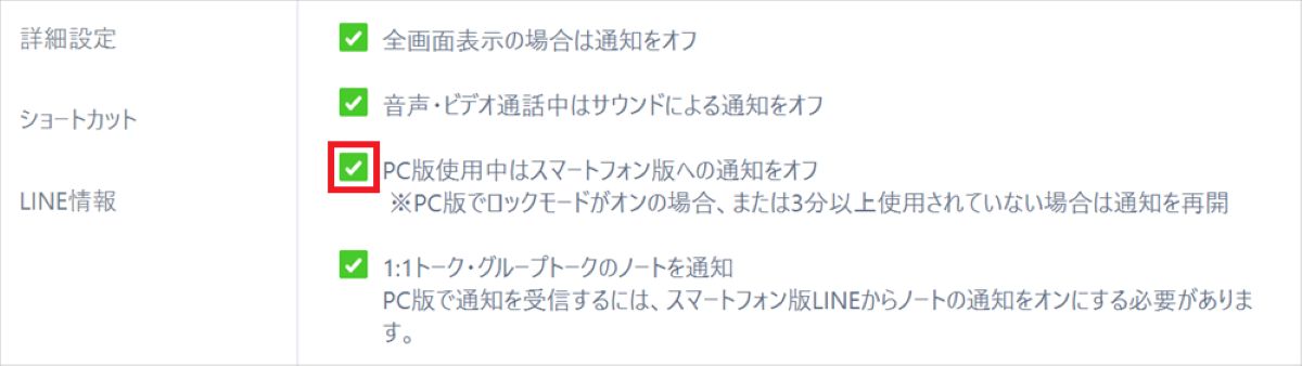 PC版LINEを使っている場合、「PC版使用中はスマートフォン版への通知をオフ」が設定されていると、PC版LINEを使用している間はスマホへの通知が届きません。