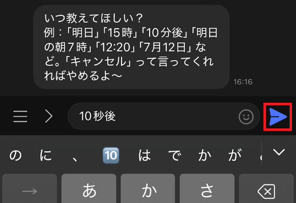 3.リマインドする時間を問われるので「10秒後」などと入力して送信する