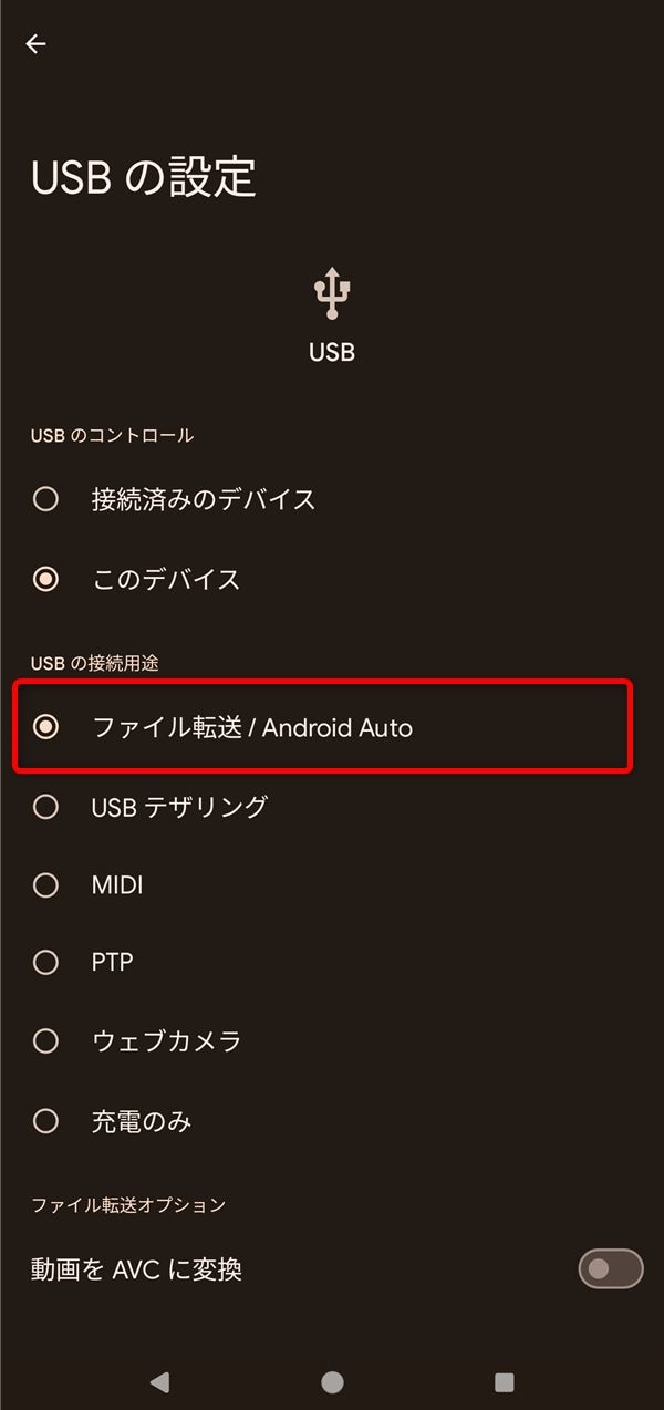 スマホとパソコンをUSBケーブルで接続し、スマホの画面でUSBの設定をデータ転送モードにします。