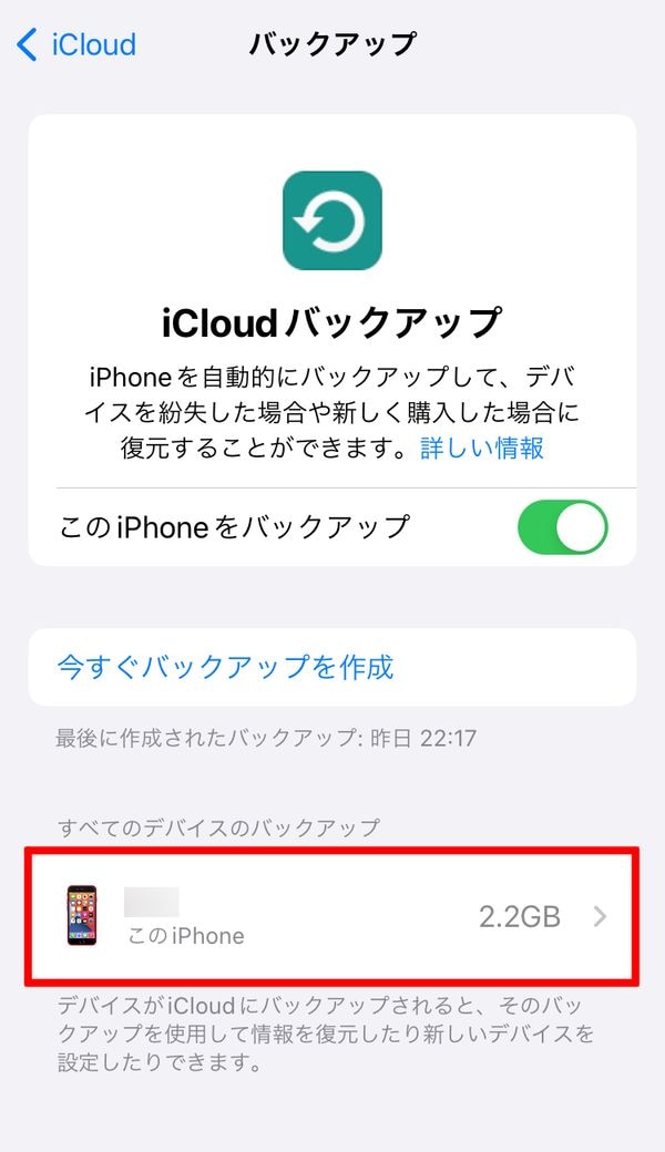 「すべてのデバイスのバックアップ」に、「iCloudバックアップ」がオンになっている製品が表示されます。利用中のiPhoneが表示されていれば、バックアップが保存されています。