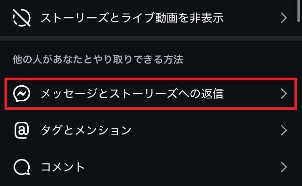 3.「他の人があなたとやり取りできる方法」の項目で「メッセージとストーリーズへの返信」をタップする