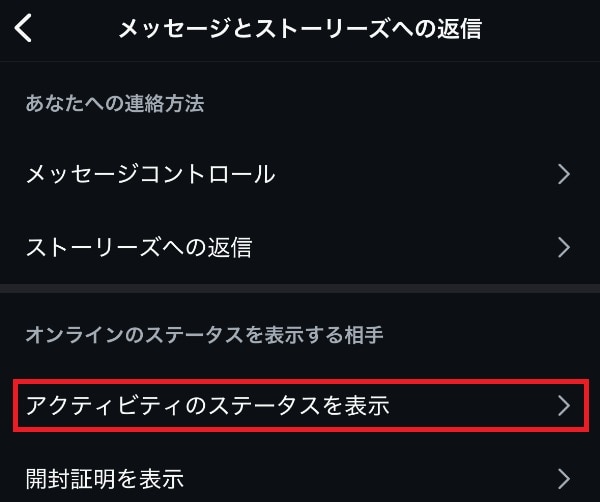 また、もうひとつの条件として、お互いがアクティビティステータスをオンにしていることがあります。インスタでは、最後にオンラインだった日時や現在オンラインであることを表示させるかどうかを、アクティビティステータスの設定項目でユーザー自身が選択できます。