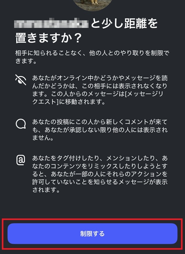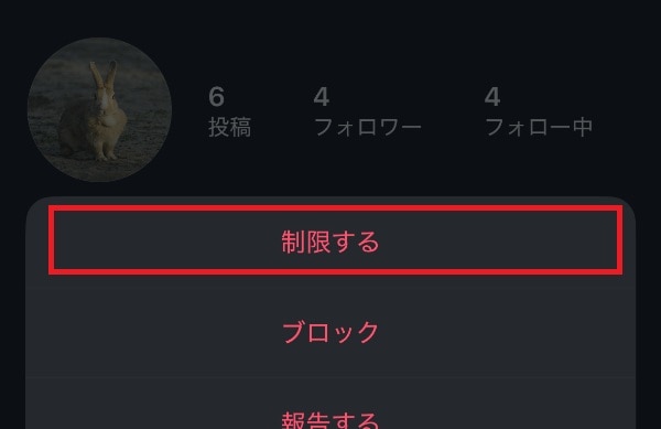 2.メニューから「制限する」をタップする(確認画面が表示されたときは、再度「制限する」をタップする)