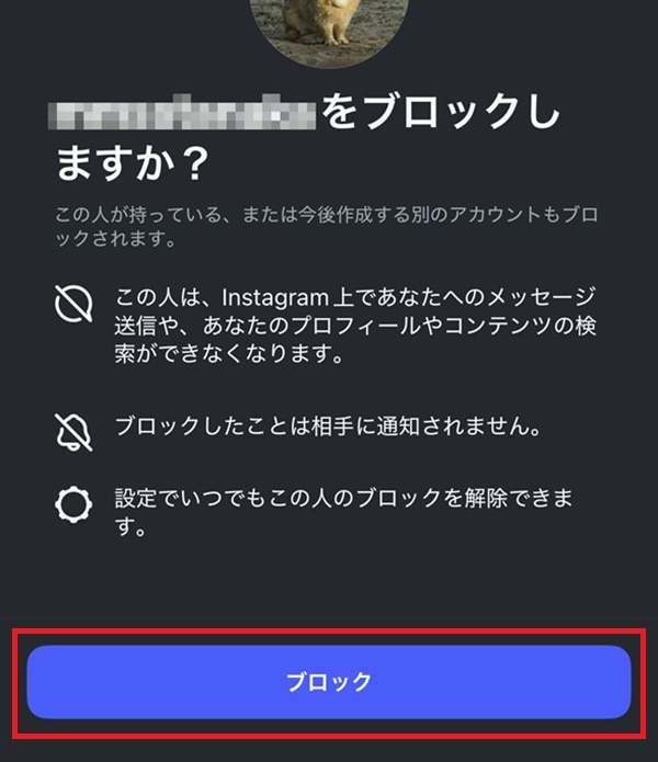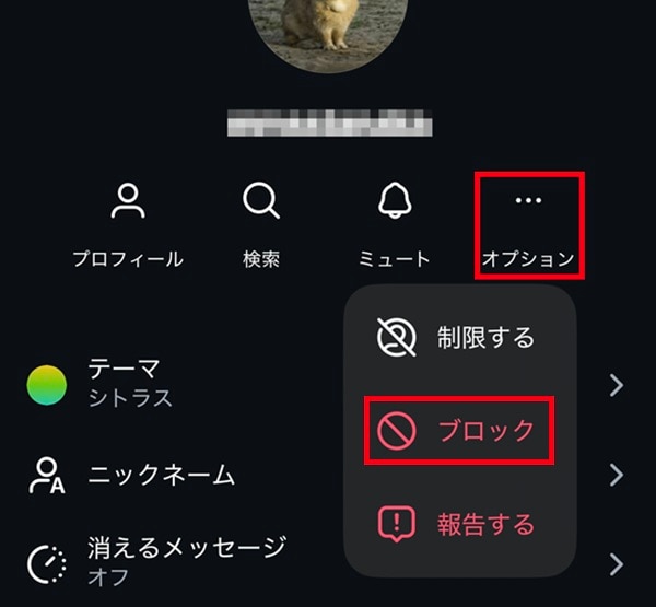 相手をブロックすると、お互いに「オンライン中」の表示が確認できなくなります。特定のアカウントをブロックする手順は、次のとおりです。