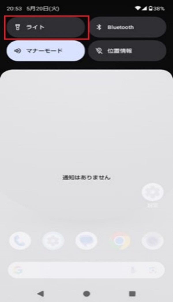 まず、画面上部から下部にスワイプしましょう。「クイック設定パネル」が表示されるので、「ライト」をタップし、オン/オフを切り替えてください。