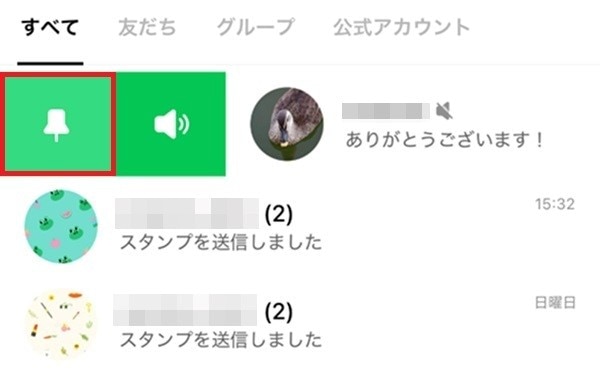 iPhoneでは固定したいトークルームを右にスワイプすると、ピン留めが選べます(Android™ではトークルームを長押しした後に「ピン留め」をタップすると、ピン留めができます)。