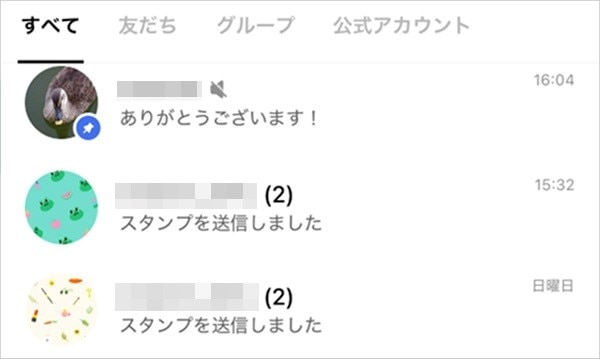 トークを「すべて」「友だち」「グループ」「公式アカウント」のカテゴリでフォルダーわけしてくれるトークフォルダーの機能があります。各タブを選択すると、該当するトークのみを表示できます。