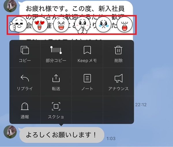 メッセージを長押しすると、メニューとともにリアクションのボタンが表示されます。使いたいリアクションのボタンを選んでタップしましょう。