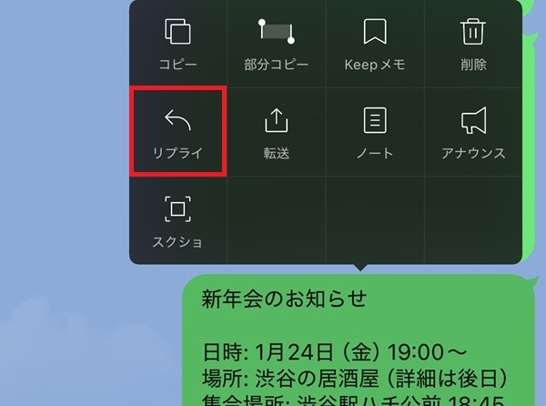 リプライするときは、引用したいメッセージを長押ししてメニューを表示し、「リプライ」を選択します。