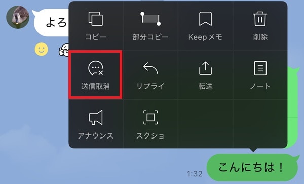 メッセージを長押ししてメニューを表示し、「送信取消」をタップします。
