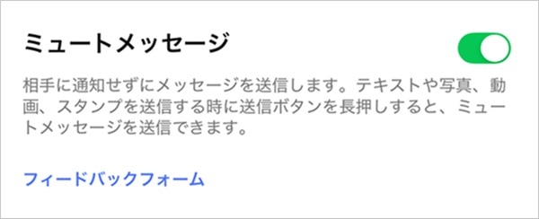 ミュートメッセージは、相手に通知せずメッセージを送れる機能です。早朝・深夜や休日、相手が忙しい時間帯などに、通知音やバイブレーションで迷惑をかけたくないときに役立ちます。