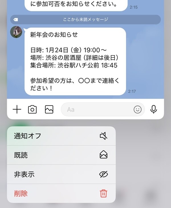 送り間違えたメッセージやスタンプは24時間以内であれば取り消しが可能です。既読・未読のどちらのメッセージも取り消せます。
