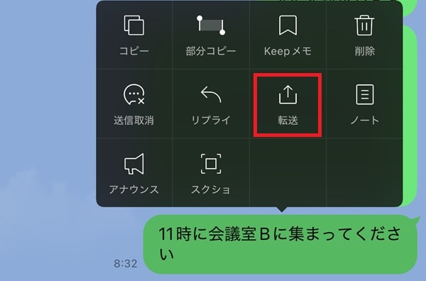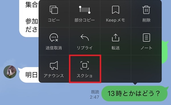 トークスクショを利用するには、メッセージを長押ししてメニューを表示し、「スクショ」を選択します。