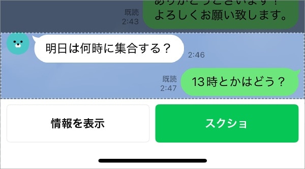 スクショの準備の画面で「情報を隠す」/「情報を表示」が選択でき、相手のアイコンを隠すことも可能です。スクショする範囲は、任意で変更できます(メッセージをタップすると、スクショの範囲を変更できます)。