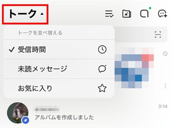 トークのタブでは、画面上の「トーク」をタップするとプルダウンが表示され、「受信時間」「未読メッセージ」「お気に入り」の3通りで並び替えができます。