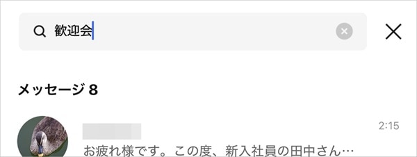 メッセージを入力して検索すると、キーワードを含むメッセージが一覧で表示されます。