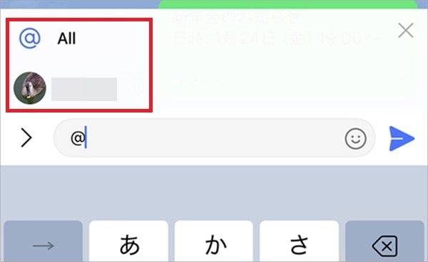 メンションは、「@」で特定の相手やグループ全体を指定して、メッセージを送信できるものです。グループの中で、送信相手を明確にしてメッセージを送りたいときに便利です。
