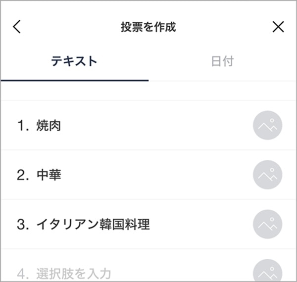 投票の種類は、テキストの質問による投票、日付の投票の大きく2つが選べます。
