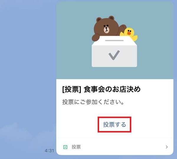 投票の作成が完了すると、トークに作成した投票が送信されます。グループのメンバーは各々「投票する」をタップして、質問への投票を行います。